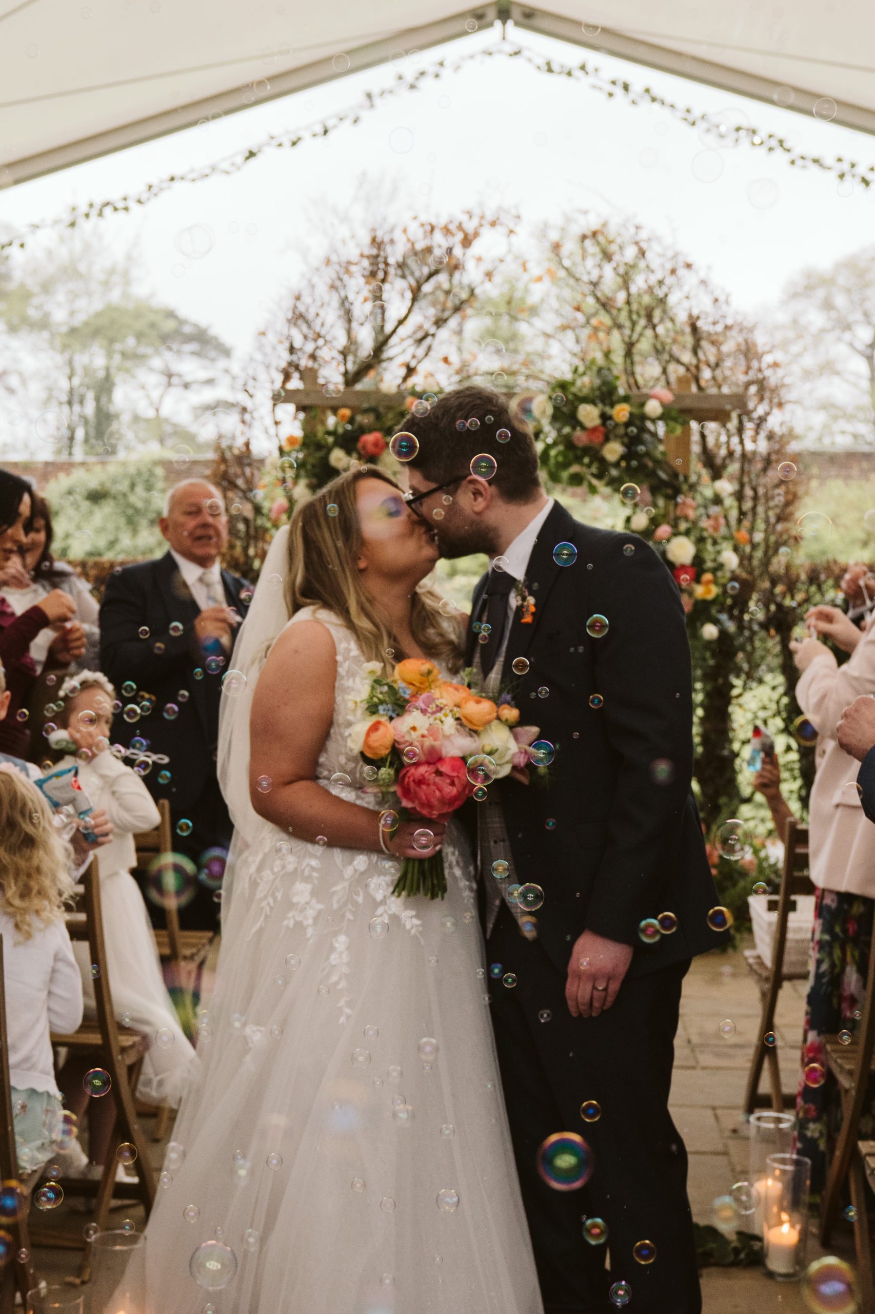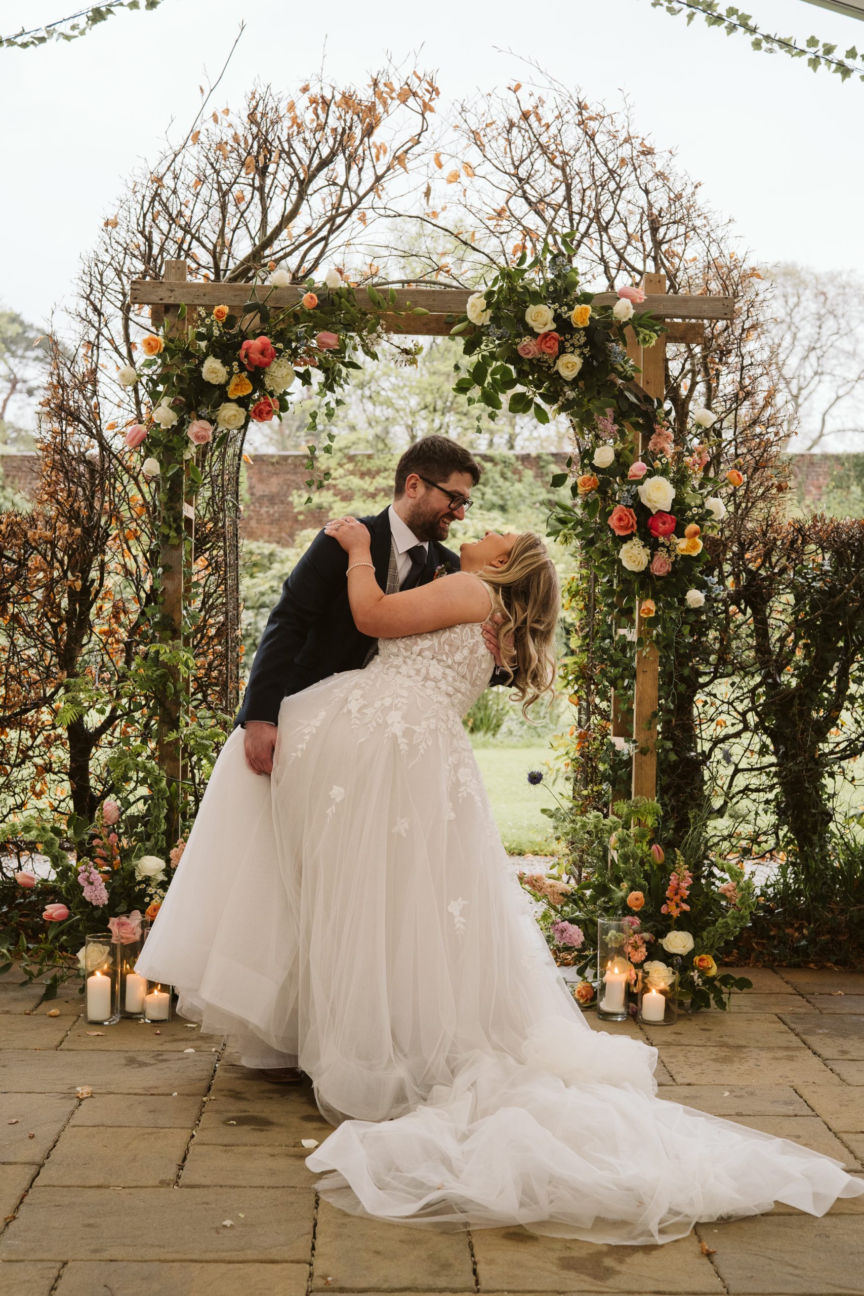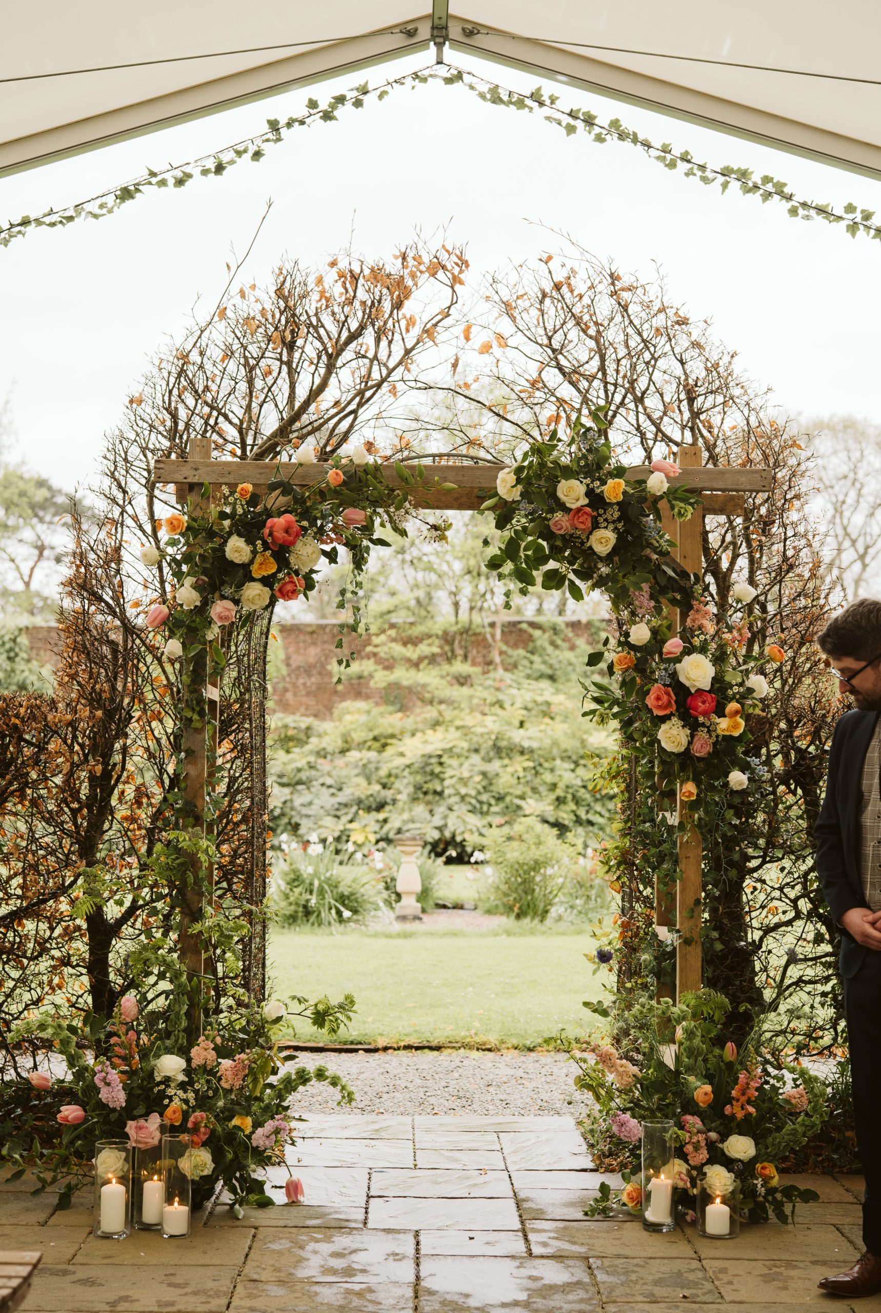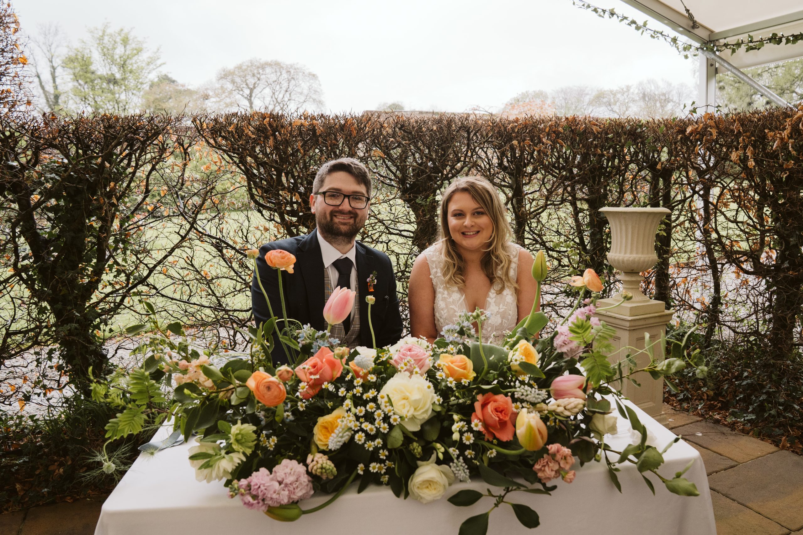 The lovely couple planned to have their wedding ceremony in the Palace Ruins but due to the weather forecast the ceremony was moved to The Strawberry Garden.  The beech hedged, canopy covered space is the perfect plan B as couples can still have their ceremony outside but are protected from the elements.  The weather didn’t dampen the spirits of Karis, Ross and their family friends in the least and they still enjoyed their drinks reception in the beautiful Ringrose Room overlooking the Walled Garden.