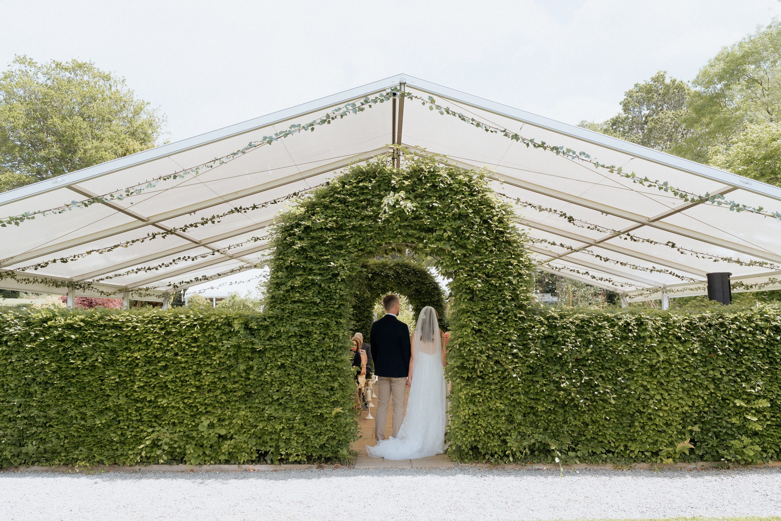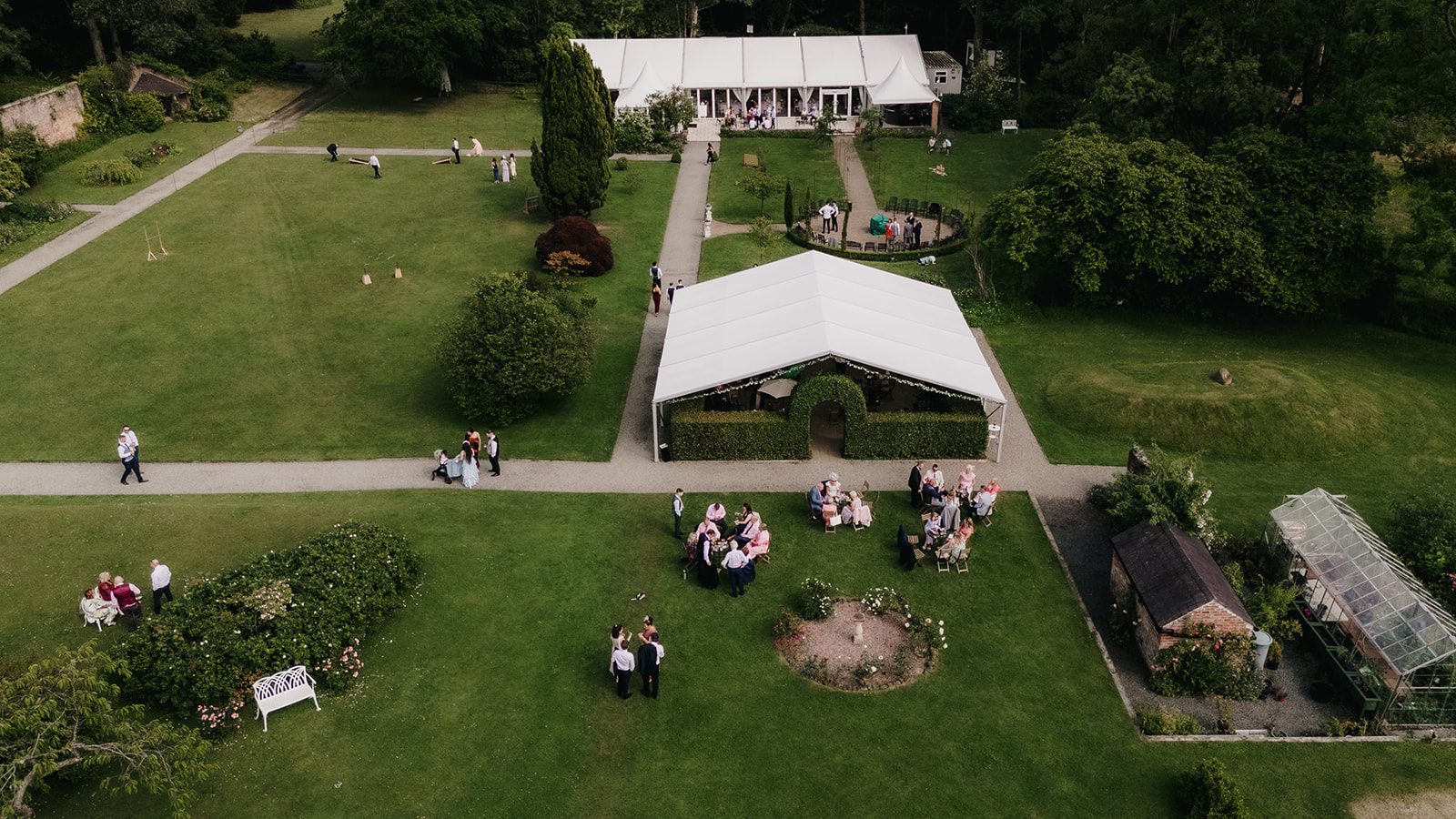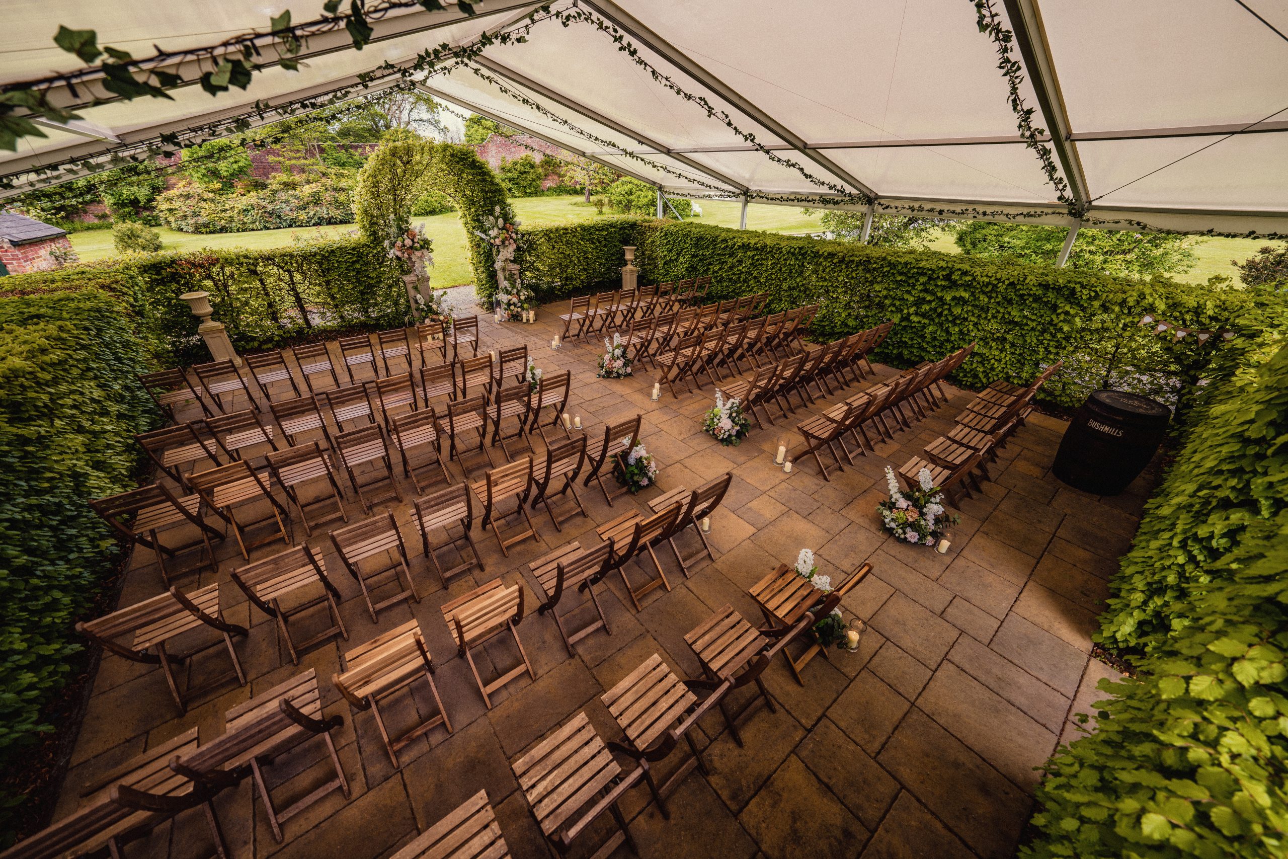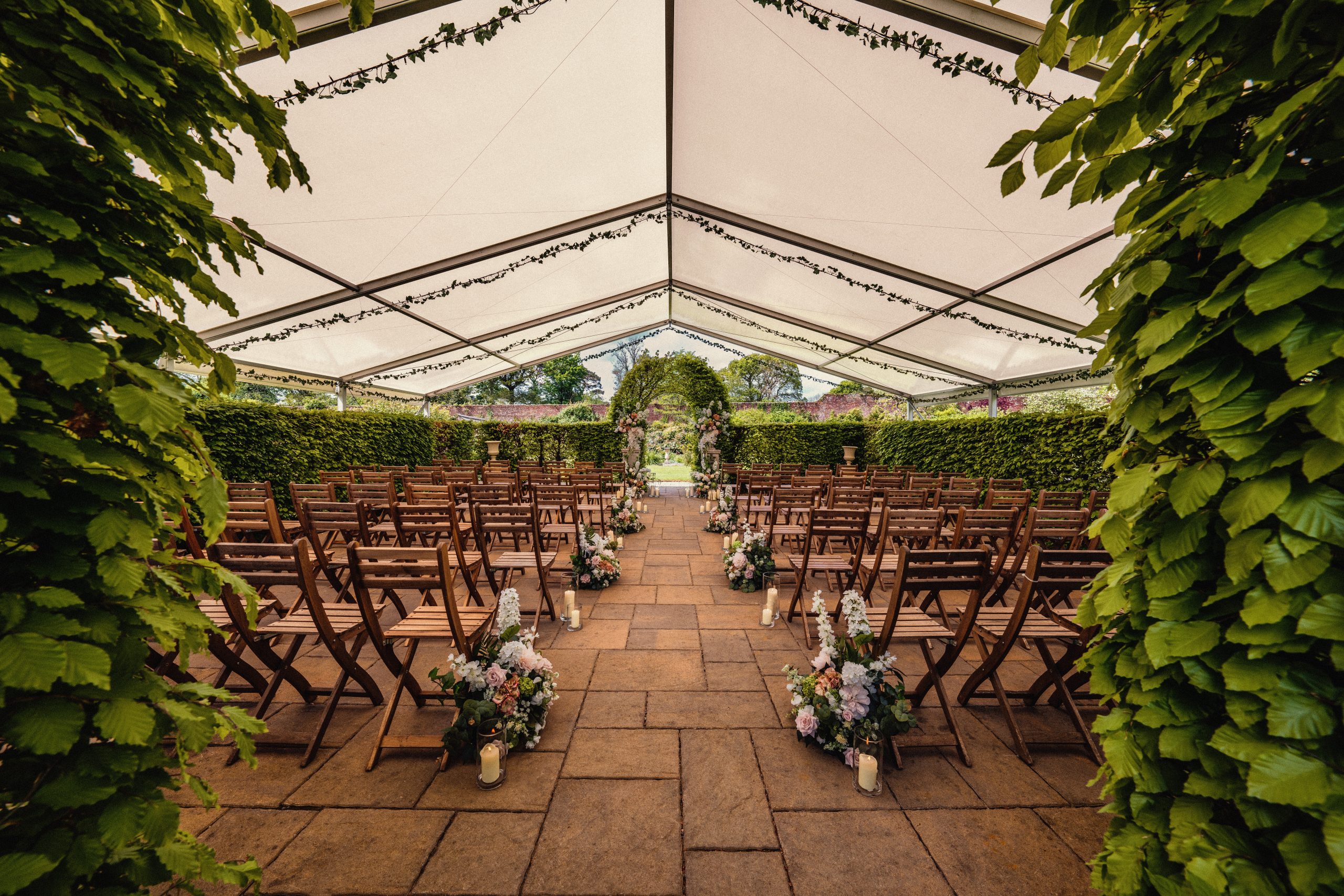 The enchanting Strawberry Garden, in the heart of the beautiful Walled Garden, seats up to 180 guests and is surrounded by beech hedges and graceful arches. An ivy and fairy light strewn canopy provides shelter from the rain and shade from the sun and great acoustics for your musicians.